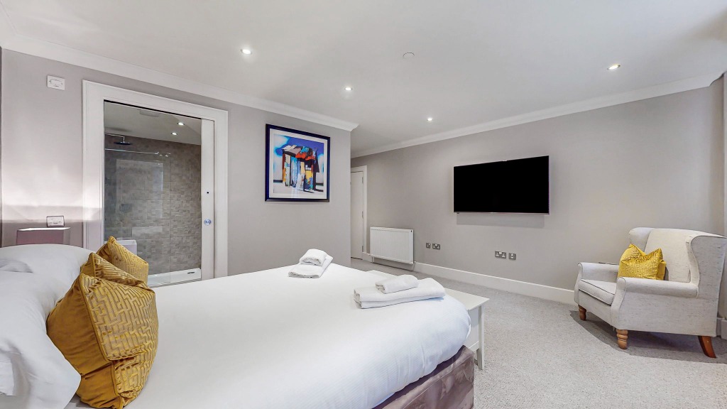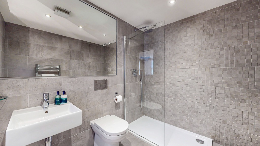 The spacious double bedrooms offer plush bedding, ample wardrobe space, and calming d'cor designed to ensure a restful night's sleep. The bathroom is equally impressive, featuring a modern walk-in shower, elegant tiling, and luxury toiletries for added comfort.
